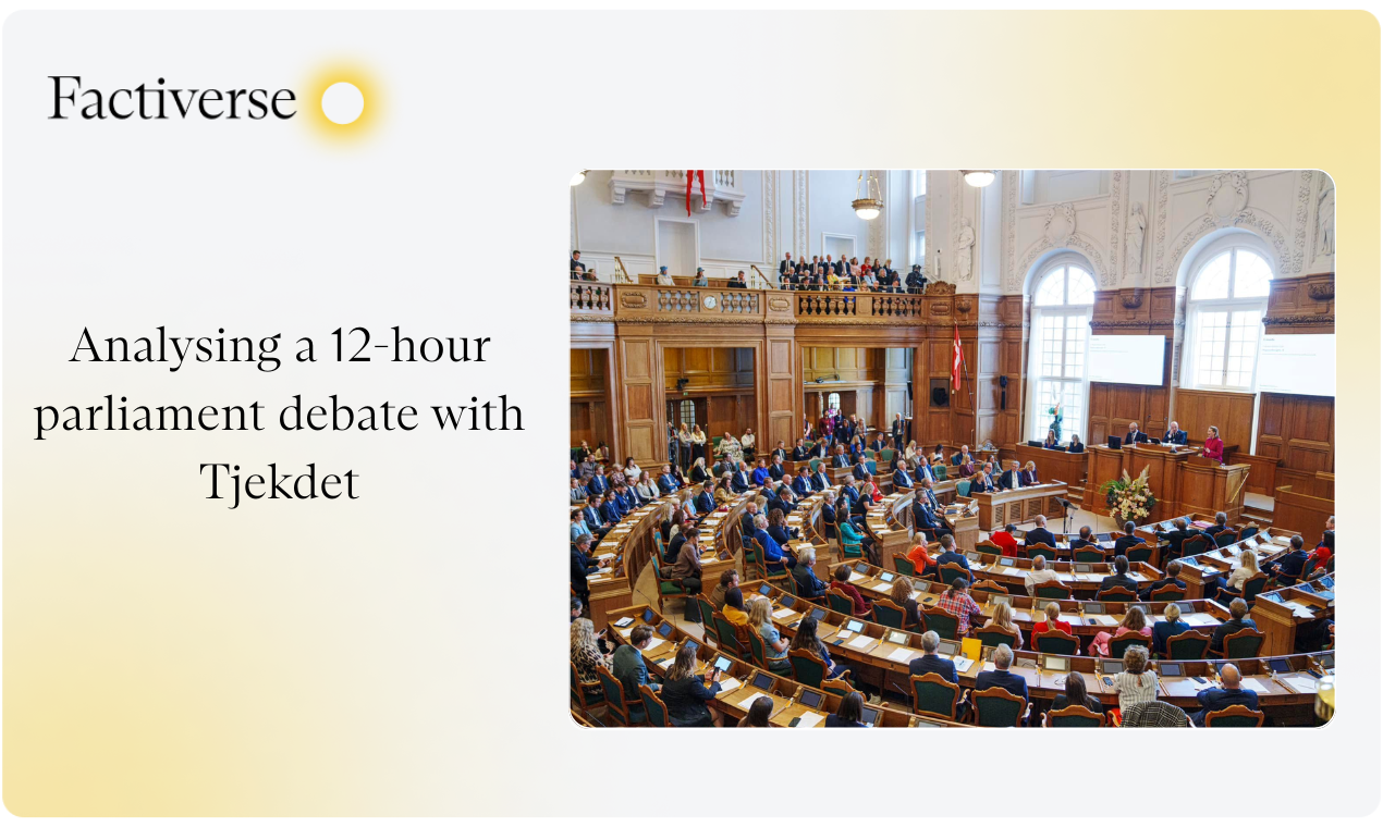 Tjekdet faced a 12-hour Danish parliament debate with a small team, constant rewinding, and no way to catch everything. Factiverse provided live transcription at 95% accuracy and extracted every checkable claim. The result: less burnout, more journalism. Their editor said it's immense potential that already saves time.